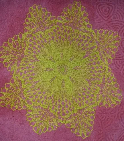 Я его расчертила на 6 и 8 лучей, нарисовала круги. Сделала это, когда набралась кучка готовых салфеток и скатерть.