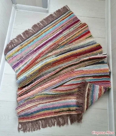 Обвязка узких сторон коврика столбиками с накидом с обеих сторон коврика, затем соединение соединительными столбиками за ближние друг к другу полупетли. Бахрома в каждый столбик с накидом