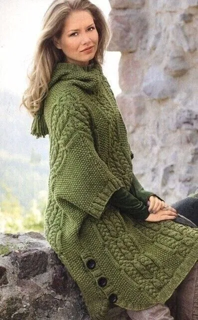 Роскошное, шикарное пончо! Хочу — хочу — хочу такое. Вкусный цвет, объемный рисунок, разрезы с пуговицами, длина - я представляю как в нем тепло и уютно, а если ещё и капюшон надеть — это полный улет, как скажут молодые люди.