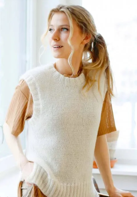 Как стильно носить белый вязаный жилет