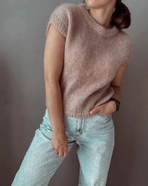 Пудровый жилет, связанный спицами — вещь, делающая образ мягким, женственным и современным