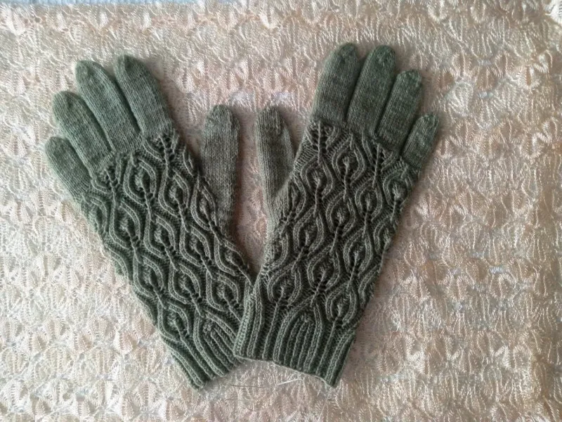 Перчатки вяжу второй раз в жизни, боялась браться за такую кропотливую работу, но после этих перчаток страх пропал. У меня получились красивенные перчатки оливкового цвета с изумрудным блеском. Я несказанно рада!