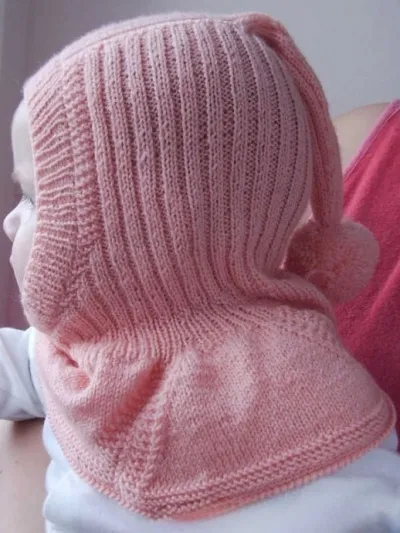 Теперь все части перенести на круговые спицы в таком порядке: спинка, боковушка, перед, боковушка и продолжить вязание по кругу. Первый ряд связать лицевой гладью, равномерно убавив 38 петель, итого в работе 126 петель. Далее вязать резинкой 1. Провязав в высоту 3см, продолжить вязание резинкой 2. С точки перехода к резинке 2 идет дальнейшее измерение высоты шапочки. На высоте работы 3см для выреза лица убавить средние 10 петель. Далее вязать прямыми и обратными рядами. Продолжать убавлять с каждой стороны от середины переда по 1 п. в каждом 2м ряду. Продолжать вязать резинкой 2, а на 3х петлях до и после кромочной вязать платочной вязкой. На высоте 24 см с каждой стороны убавить 32 петли. Оставшиеся средние 34 петли временно отложить.