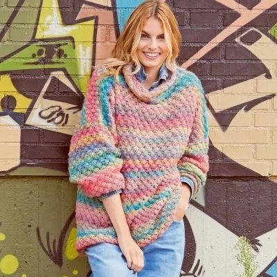 ВАМ ПОТРЕБУЕТСЯ Пряжа (30% полиамида, 25% мохера, 25% шерсти альпака, 20% натуральной шерсти; 330 м/100 г) — 300 (400) 400 г в сине-зелено-красно-желтых тонах секционного крашения; спицы №5 и 8; круговые спицы №8.