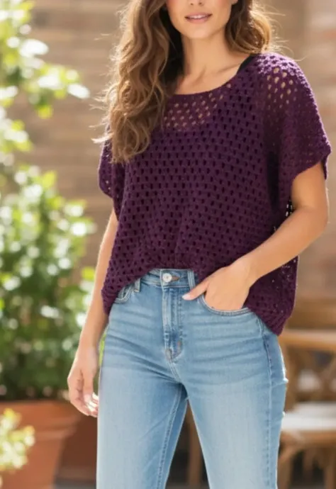Летняя кофточка крючком — лёгкость в баклажанном цвете