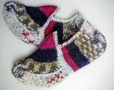 Накиды провязываются всегда изнаночной петлей . Верх вяжется резинкой 1х1 У меня на спицах получилось 73 петли. Последний раз накиды делала с изнаночной стороны . Делим на три части 26-21-26,мысок вяжем как пятку на средних 21 петлях, захватывая боковые, пока не кончатся петли на боковых спицах.