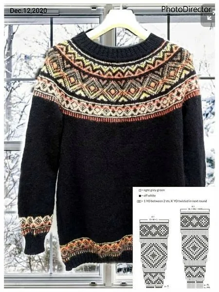 Начинала с 176 петель +1 для замыкания итальянским набором + ложная кетлевка. По схеме выбрала XL и мой раппорт был 11 петель. По завершении схемы поняла что длинны кокетки на мой рост не хватает и довязала еще пару см рисунком. На спицах было 352 петли.Затем поделила на спинку перед и рукава(58+118+58+118) и вязала только спинку 3 см(азиатский росток). Сделала примерку и после замеров добавила по 20 петель на подрезы. Отделила тело от рукавов и продолжила вязать как при обычном реглане. По бокам прибавляла 6 раз по две петли.
