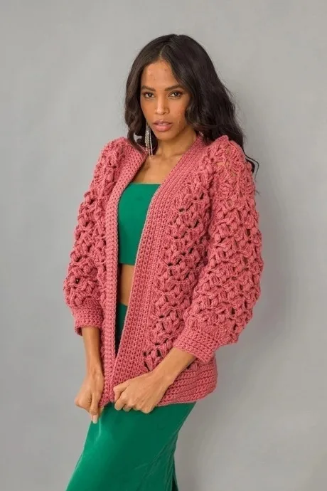 Розовый жакет крупной вязки — это вещь с характером: тёплая, уютная и очень стильная. А когда он связан крючком вручную, в каждой петельке чувствуется особое тепло и настроение ручной работы.