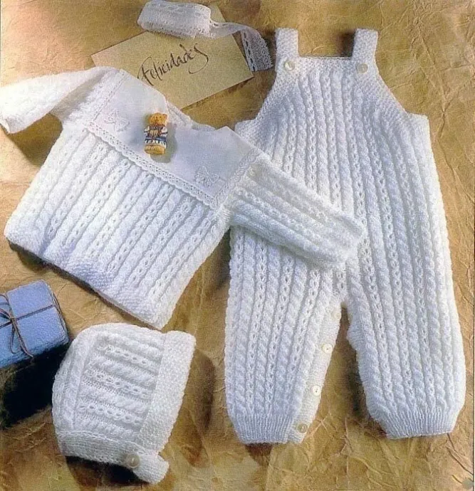 Размер: на возраст 0-3 мес. Вам потребуется: 200 г акриловой пряжи белого цвета, 17 пуговиц, квадратный воротничок, спицы № 2,5 и № 3. Узоры для вязания: Резинка: вязать попеременно 1 лиц., 1 изн. Изн. р. вязать по рисунку. Жемчужный узор (жемч. узор): вязать попеременно 1 лиц., 1 изн., смещая узор в каждом р. Двойная резинка: вязать резинкой 1x1, при этом в лиц. и изн. р. лиц. п. провязывать, а изн. п. снимать, оставляя нить перед работой. Фантазийный узор: по схеме. Плотность вязания: 10 см = 27 п. Описание работы. Комбинезон Задняя деталь На спицы № 2,5 для каждой штанины набрать по 28 п. и связать 3 см резинкой.