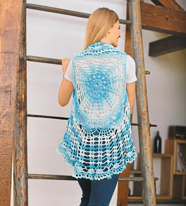 Оригинальный ажурный жилет связан по кругу из пряжи секционного крашения