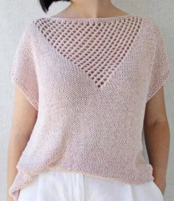 Для вязания нам потребуется 6 мотков — на оверсайз 44-48 — пастельно-розовой пряжи ( цвет № 106) Solo Lino Melange от Lana Grossa: 80% переработанный лён (вискоза), 20% лён; 50 гр — 105 м. Спицы № 5,5.