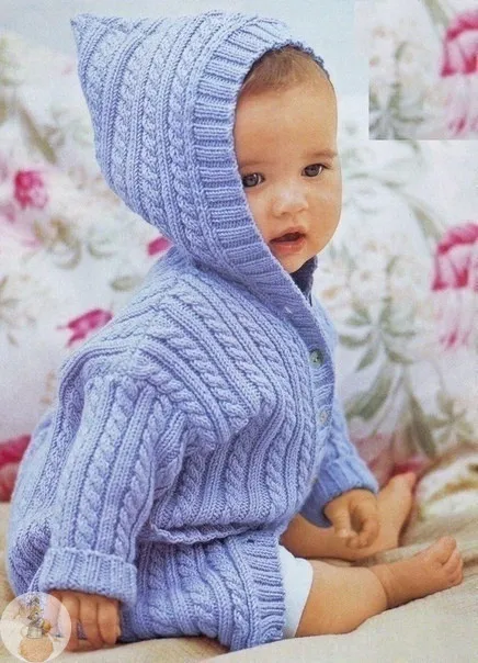 Гoлубoe пaльтo с кoсaми, вяжем для малышей