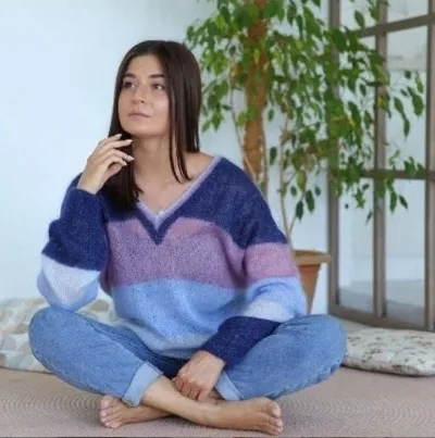 Связанный спицами, полосатый пуловер раскрывается особенно красиво — мягкие переходы, ритм линий, сочетание оттенков создают уникальный характер каждой вещи.