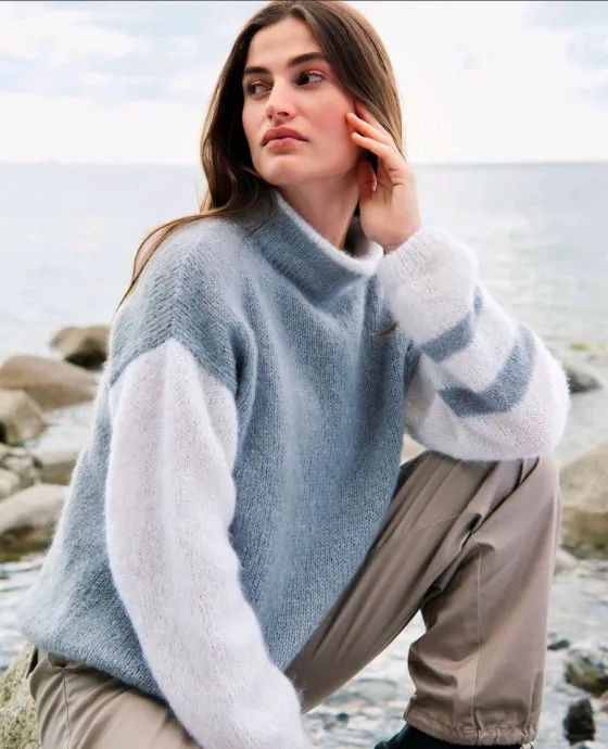 и 175 (200–200–225–225) г светло-серой (цв. 2) пряжи Superkid Seta (65% мохера суперкид, 35% шелка, 100 м/25 г) фирмы Lana Grossa; прямые спицы № 4 и № 4,5, круг. спицы № 4 длиной 50 см.