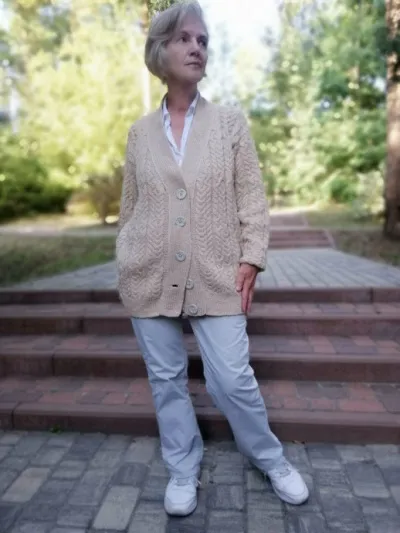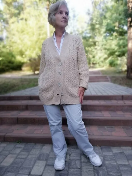 С боковой стороны переда равномерно делаем 4 прибавления по 1 петле (10,20,30 и 35 см от резинки) = 77 петель