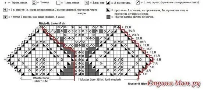 21 ряд - *протяжка,5лиц., 2вм. лиц, накид, 1лиц. скрещ., накид, 3вм. лиц., накид, 3лиц., накид, 3вм. лиц., накид, 1лиц. скрещ., накид*