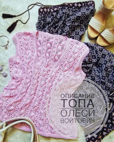 На высоте 41-42 см от начала вязания убавить для пройм с обеих сторон 6 п., затем закрыть в кажд. 2-ом ряду 1 раз 3 п., 1 раз 2 п., и 7 раз по 1 п. Через 16 см от начала пройм отложить для горловины средние 48 п. Для закругления выреза закрыть в кажд. 2-ом ряду 4 раза по 1 п. На высоте 2,5-3 см от начала горловины закрыть 32 п. плеча.