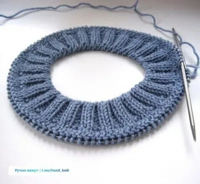 Вяжем горловину до необходимой высоты, затем переходим к имитации пришивной горловины. Ряд 1: вяжем все петли лицевыми петлями.