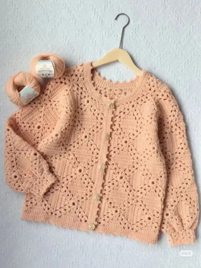 Персиковый кардиган на пуговицах, связанный крючком из мотивов — это настоящее воплощение уюта и женственности