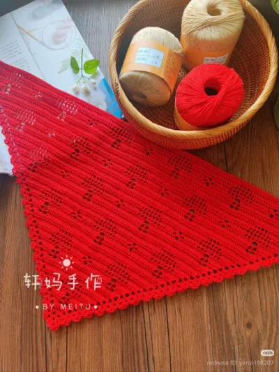 Красная косынка, связанная крючком с узорами мухоморов — это смелый акцент