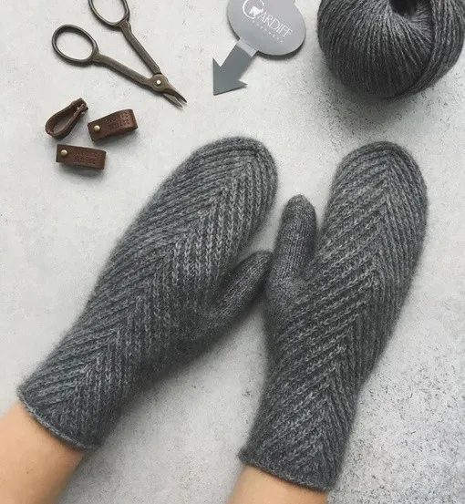 Узор состоит из параллельных линий, связанных лицевыми петлями на изнаночной глади, которые сходятся относительно центра варежек с лицевой стороны. Большие пальцы рук связаны простой лицевой гладью. Традиционная резинка, с которой начинаются варежки в этом варианте отсутствует.
