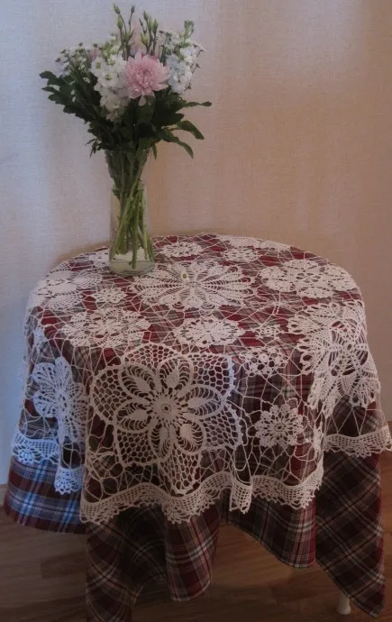 Спасибо всем за теплую встречу! Скатерть по принципу ирландского кружева, но я к сожалению этой техникой не владею. Набираю понравившиеся салфеточки, сначала вяжу круг обвязки нужного размера, потом в середину круга выкладываю салфетки, накалываю их и между собой связываю.