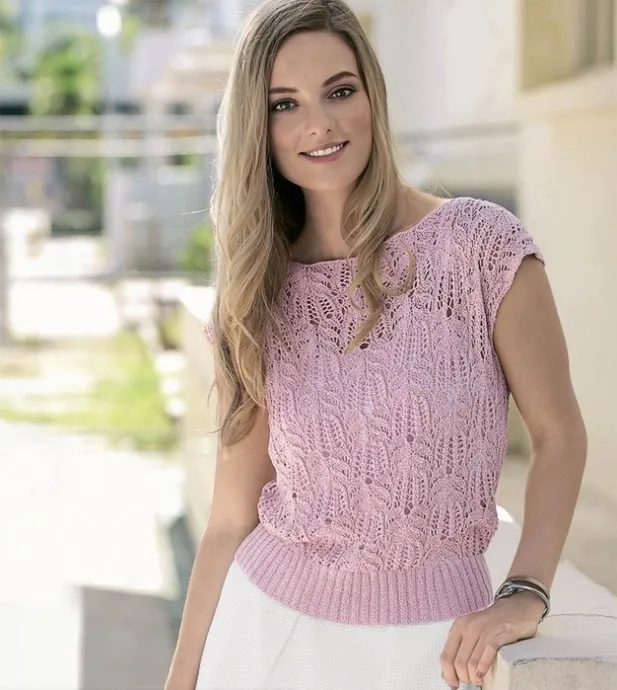 Очень понравилась модель блузочки , и я думаю найдутся мастерицы , которые захотят связать такой топ.