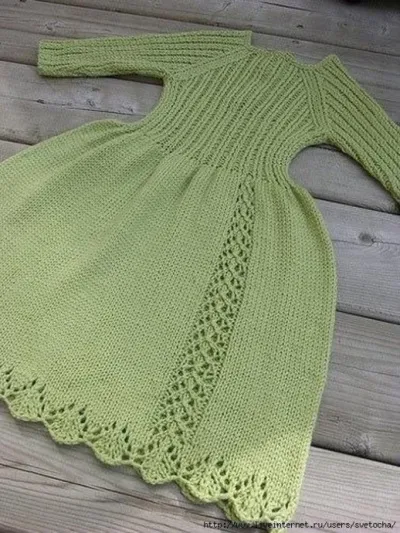 Это платье было вдохновленно работой Гил Этон из книги Minnow Knits II. Подол кружевной (8 кругов). Вставная кружевная вязка из 7 петель. Это зимнее/осенние платье. Оно вяжется снизу верх. Туловище вяжется перекрученной резинкой. Рукав 3/4 и вяжется как реглан.