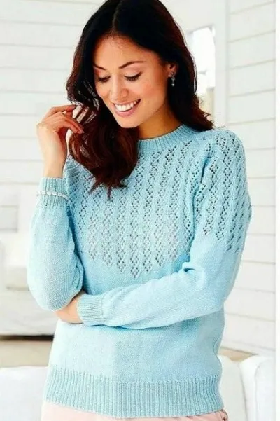 Для вязания пуловер спицами потребуется: 400 (400) 450 г. пряжи Sublime Baby Cashmerino Silk 4 ply (75% шерсть, 20% шелк, 5% кашемир); спицы 2,75 мм и 3,25 мм; 4 держателя петель. Плотность вязания, спицы 3,25 мм: лиц.гладь - 28 п. и 36 р. = 10 см; ажурный узор - 28 п. и 40 р. = 10 см.