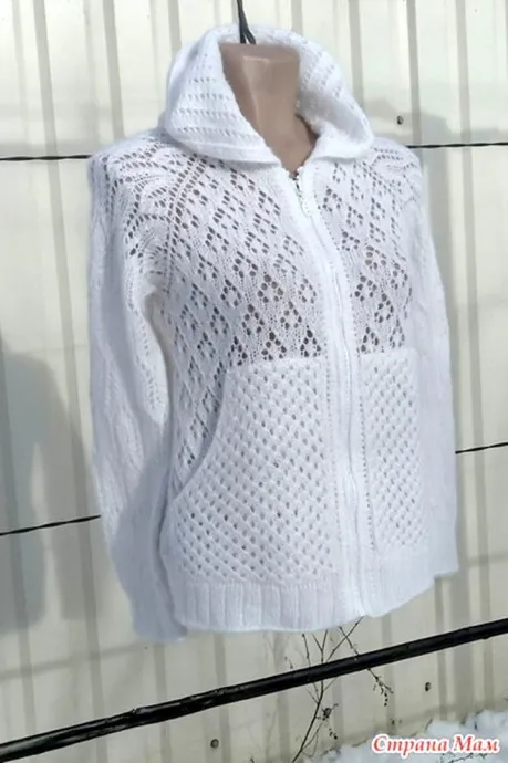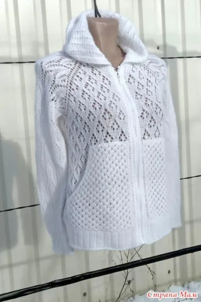 Женская вязаная толстовка с капюшоном, карманами «кенгуру» и застежкой на молнии, так называемая «худи», выполняется различными ажурными рисунками.
