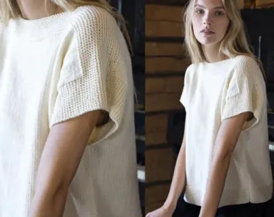 Этот женский топ с цельнокроеным рукавом вяжется совсем просто. Его сможет связать даже начинающая мастерица. Несложная вязка, выкройка прямоугольником одной деталью – беритесь смело за спицы.