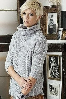 На спицы меньшего размера наберите 124 (132,140,148,156,164) п. Провяжите 19 р. ломаной резинкой, закончите 3-м рядом. Перейдите на спицы большего размера. Начальный ряд (изн.): Вяжите 16 (20, 22, 26,28,32) п. жемчужным узором, поместите маркер, 2 лиц., [6 изн., 2 лиц.] х 2 раза, маркер, вяжите 15 (15,17,17,19,19) п. жемчужным узором, маркер, 3 лиц., [4 изн., 4 лиц. ] х 2 раза, 4 изн., 3 лиц., маркер, вяжите 15(15, 17,17,19,19) п. жемчужным узором, маркер, 2 лиц., [6 изн., 2 лиц.] х 2 раза, вяжите 16 (20, 22, 26, 28, 32) п. жемчужным узором. Начало узора по схемам 1 ряд (лиц.): Вяжите 16 (20, 22, 26, 28, 32) п. жемчужным узором, маркер, вяжите 1- й ряд схемы 1 на 18 п., маркер, вяжите 15 (15, 17, 17, 19, 19) п. жемчужным узором, маркер, вяжите 1-й ряд схемы 2 на 26 п., маркер, вяжите 15 (15, 17, 17, 19, 19) п. жемчужным узором, маркер, вяжите 1-й ряд схемы 1 на 18 п., вяжите 16 (20, 22, 26, 28, 32) п. жемчужным узором. Продолжайте вязать таким образом, пока раппорт из 32 рядов схемы 2 не будет повторен 6 раз. Длина изделия 55 см от начала. Повторите р. 1-16 еще 0 (0, 0, 1, 1, 1) раз. След. ряд (лиц.): Вяжите 16 (20, 22, 26, 28, 32) п. жемчужным узором, маркер, вяжите след. ряд схемы 1 на 18 п., маркер, вяжите 15 (15, 17, 17, 19, 19) п. жемчужным узором, маркер, вяжите 33-й (33-й, 33-й, 17-й, 17-й, 17-й) ряд схемы 2 на 26 п., маркер, вяжите 15 (15,17, 17,19,19) п. жемчужным узором, маркер, вяжите след. ряд схемы 2 на 18 п., вяжите 16 (20, 22, 26, 28, 32) п. жемчужным узором. Закройте все петли по рисунку.
