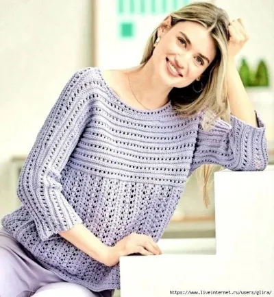 Для вязания нам потребуется 450 (500) 550 г сиреневой пряжи: 70% хлопок, 30% полиамид; 125 м/50 г.