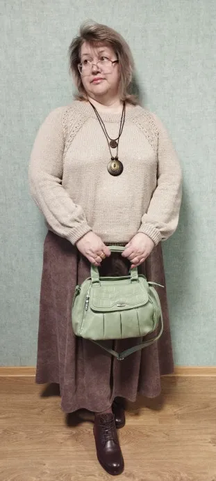 Очень понравился Ваш джемпер! Наировнейшая лицевая гладь, великолепная посадка на модели, шикарный узор, красивая отделка горловина, изумительный реглан!