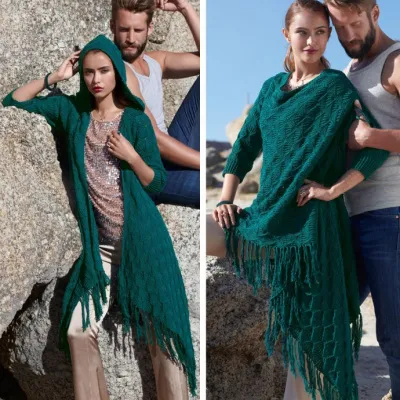 Для планки набрать на длинные круговые спицы по передним краям полочек, включая клинья, и краю капюшона равномерно петли и вязать 2 см резинкой, затем петли закрыть.