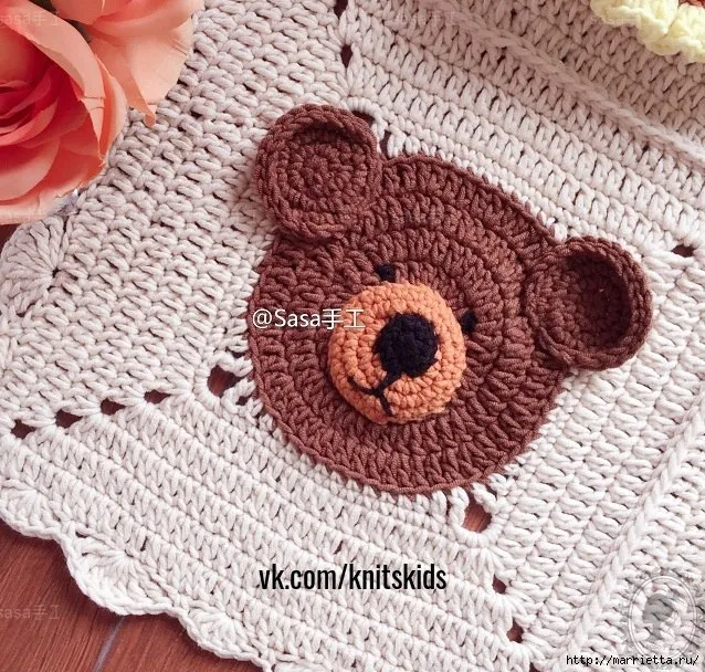 Детский плед крючком мотивами с мишками, львами и тиграми.