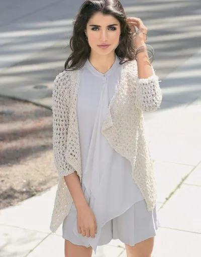 Равномерный сетчатый узор делает эту совсем несложную модель, связанную из двух видов пряжи, очень нежной.