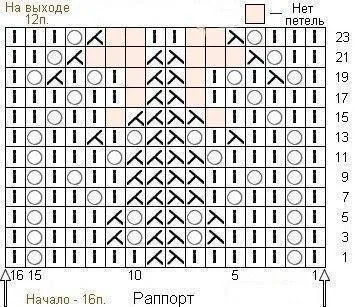 Располагаем пять мотивов основного узора так, чтобы центральный мотив оказался по центру переда. Вяжем основным узором прямо до проймы 34 см (136 рядов).