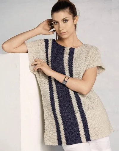 Эта несложная свободная туника связана полупатентным узором в поперечном направлении, от рукава к рукаву.