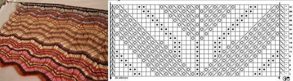 Красивый разноцветный волнистый узор спицами используется для пледов, пуловеров, юбок 1-й ряд: *(2 вместе лиц.) – 6 раз, (накид, 1 изн.) – 6 раз, повторять от *. 2-й ряд: лиц. петли. 3-й ряд: и...