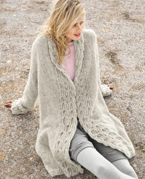 Для расширения воротника через 41 см = 94 р. от планки по левому краю прибавить 1 х 1 п., затем попеременно в каждом 6-м и 8-м р. прибавить 10 х 1 п. следующим образом: перед узором из «кос» вывязать из протяжки 1 лицевую скрещенную, прибавленные петли включать в узор лицевой глади.
