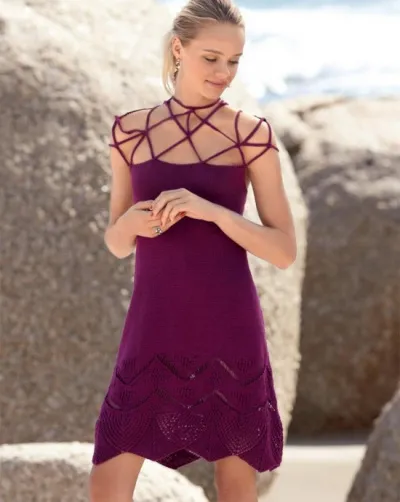 Романтичное, соблазнительное, оригинальное платье. Нижняя часть модели связана на спицах крупным зубчатым узором и гладью, а кокетка собрана по схеме из шнуров, выполненных крючком.