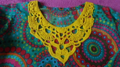 Была у меня цветная хлопковая туника с очень узкой горловиной. И конечно же она начала рваться. И я решила ее переделать...