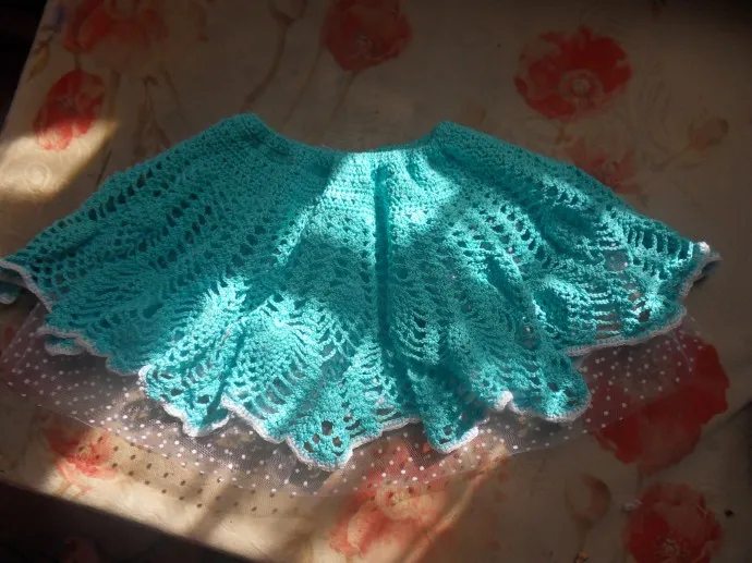 Все таки мы надеемся, что лето у нас будет. Поэтому связалось платье и шляпка, а юбочка была связана лет на 5 пораньше. Юбку вязала для старшей уже давно, но вот после разбора в шкафу она нашлась)). Правда была без нижнего фатина, а у меня оставался кусочек небольшой и его я решила пустить на нижнюю юбку для пышности.