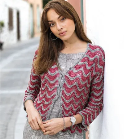 Пряжа (60% вискозы, 32% хлопка, 8% полиамида; 140 м/50 г) — 200 (250) 300 г красной и 100 (150) 150 г серебристо-серой; спицы №4,5; круговые спицы №4; 7 пуговиц со стразами в форме сердца.