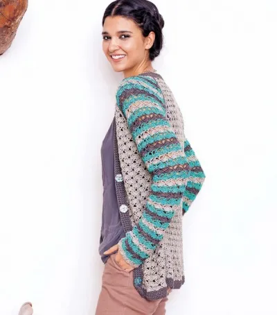Несложный в исполнении облегающий жакет с контрастными полосами. Идеален для теплых дней.