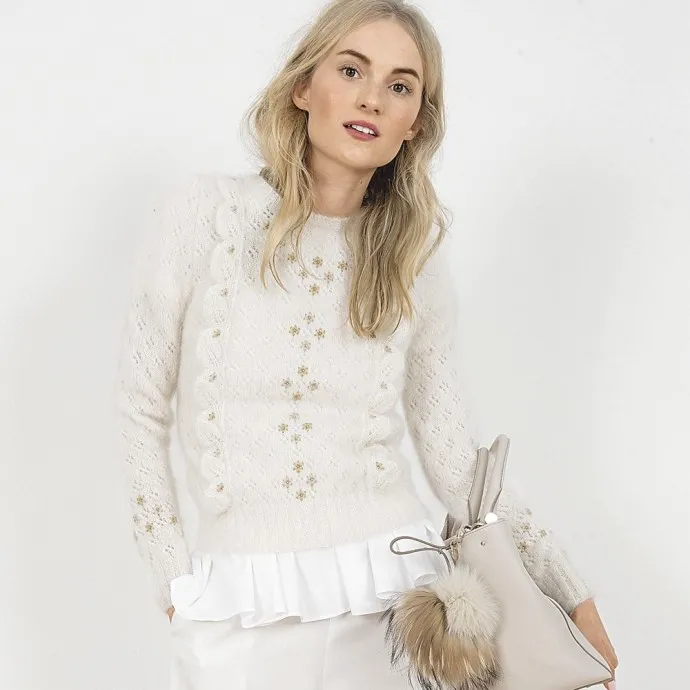 Этот джемпер яркий пример романтического стиля: рюши, ажур, вышивка на белом... К этому можно еще добавить воздушную легкость мохеровой пряжи и облегающий силуэт.