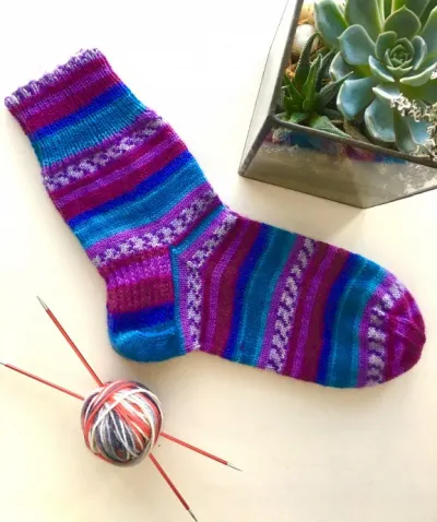 А носочки из этой пряжи вязать одно удовольствие — не надо заморачиваться с рисунком, он сам вывязывается.