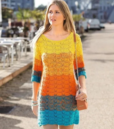 Это мини-платье с сочетанием пряжи разных цветов придется по душе тем, кто любит яркие цвета.