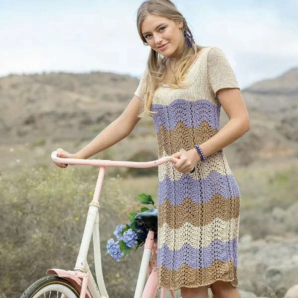 Прямое платье с коротким рукавом — беспроигрышный вариант для летнего гардероба. Эта модель смотрится динамично за счет волнистого трехцветного узора.